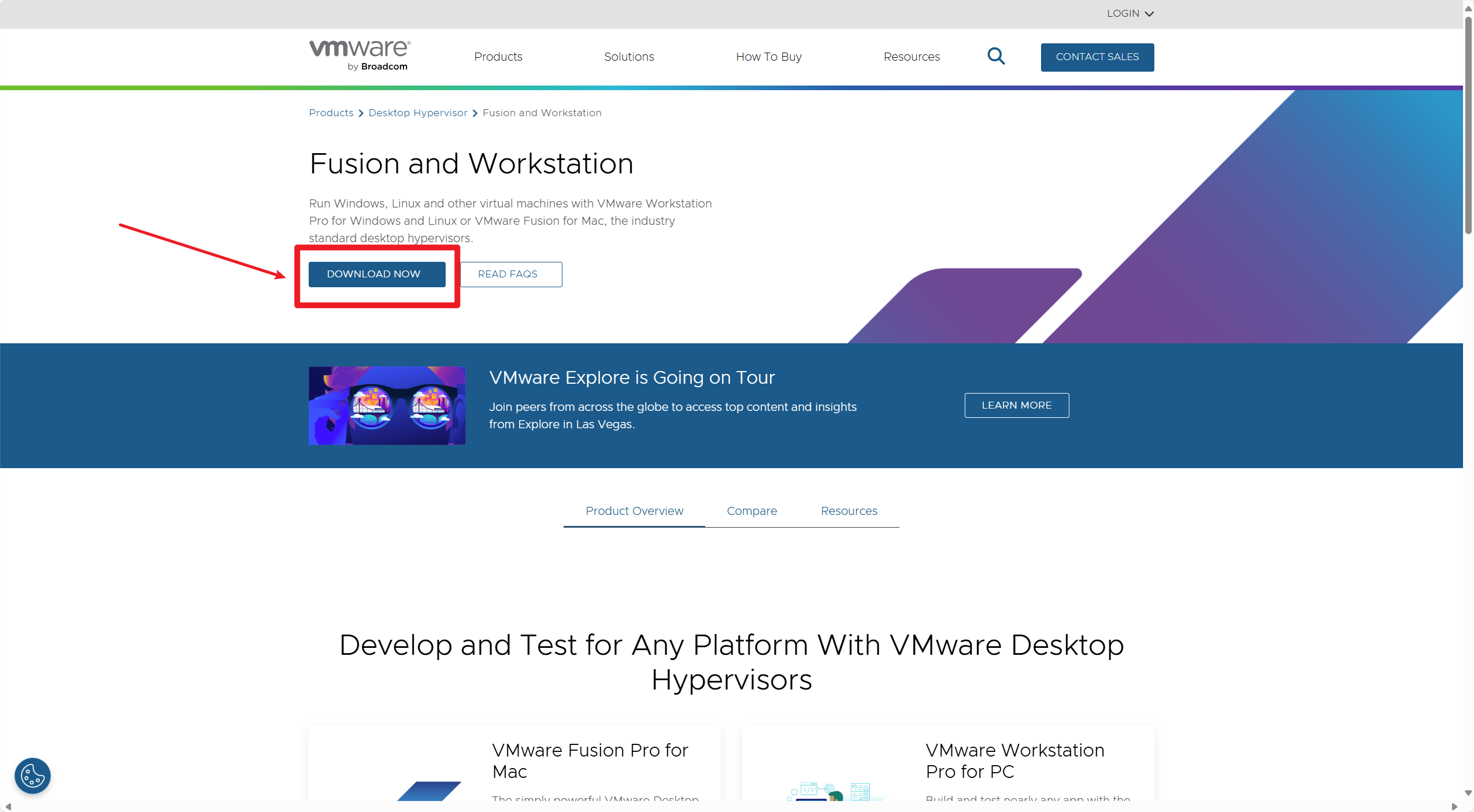 往下滑,找到 Fusion and Workstation 并点击,跳转到新页面,点击 DOWNLOAD NOW